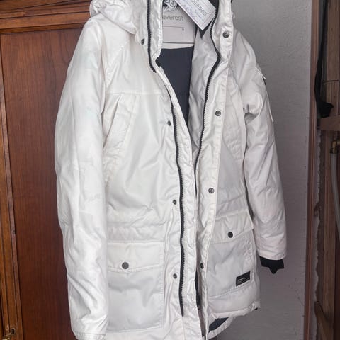 Valkoinen Everestin toppatakki. Ollut käytössä yhden talven, kunto on hyvä ja käytönjälkiä ei näy.