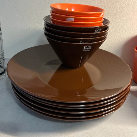 Arabiaastiastosetti, jossa ruskeita ja oransseja osia. Kuvassa näkyy useita matalia lautasia, kulhoja sekä mukeja kahdessa värissä. Sopii arki- tai kattausastiastoksi keittiöön. Kahvikupin hinta 4€, lautasen hinta 5€ ja kulhon hinta myös 4€.