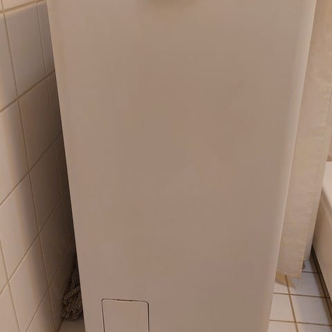 Kompakti päältä täytettävä Rosenlewin pyykinpesukone pois sivusta täytettävän tieltä.
