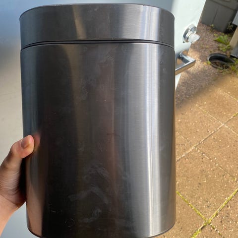 Grafiitinharmaa. M-koko, astian tilavuus: n. 18 litraa. Astioita on 4 kpl, osta yksi tai vaikka kaikki. Hinta 10 €/kpl. Astiat eivät haise, eikä niissä ole pidetty seka- tai biojätettä.