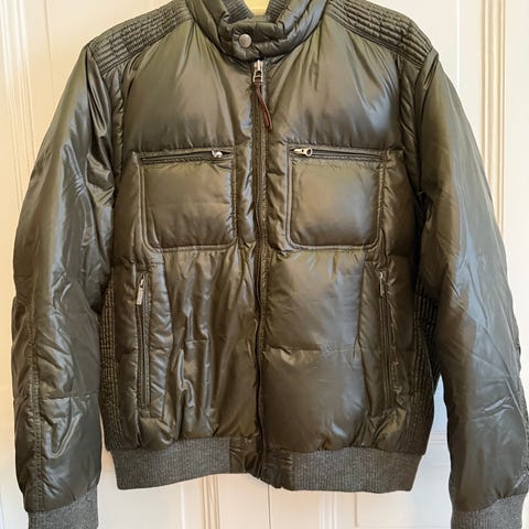 Edessä heijastin tarrat kahden reiän kohdilla. Muuten takki on ehjä ja siisti sekä lämmin.