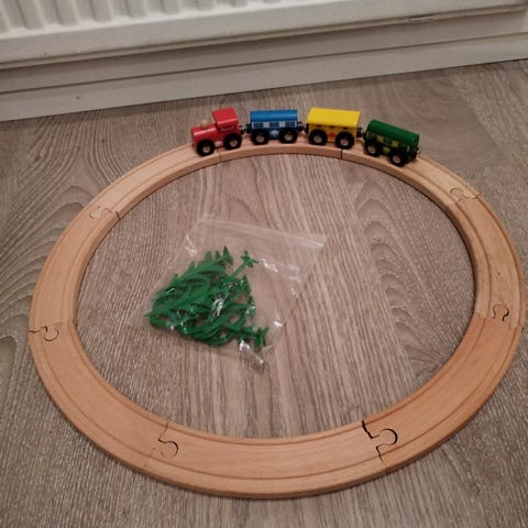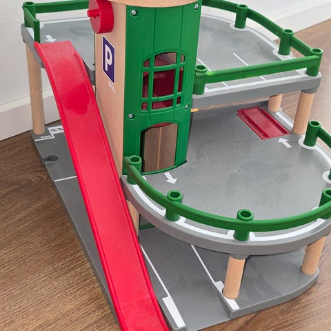 Brio puinen leikkijunarata asema ja parkkitalo.