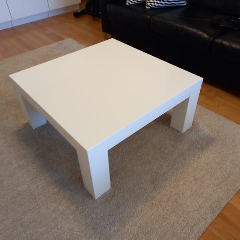 Veken sohvapöytä. Pöytä muuten hyvässä kunnossa, mutta pöydän pinnassa pieni kupru.