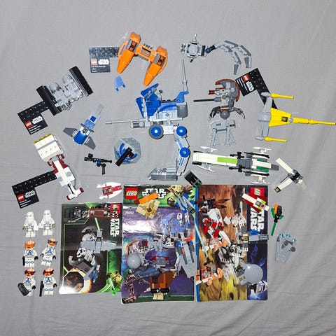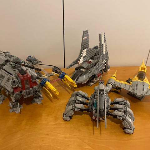 Lego Star Wars rakennussarjat, useita eri aluksia ja ajoneuvoja. Kuvat esittävät valmiiksi koottuja Star Wars -teemaisia Lego-aluksia sekä niihin kuuluvia ohjekirjoja. Sopii Lego Star Wars -kokoelmaan, rakenteluun ja leikkeihin.