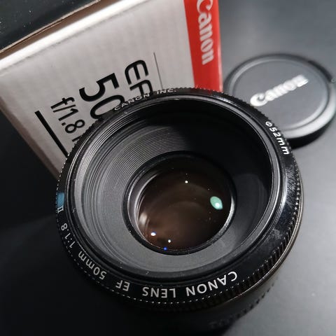 Kiinteä 50 mm polttoväli ja valovoima f/1.8. EF-kiinnitys Canonin järjestelmäkameroille.