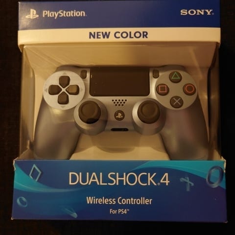 DualShock 2 avaamattomana paketissaan. Kulmasta pieni pala lohjennut pois.