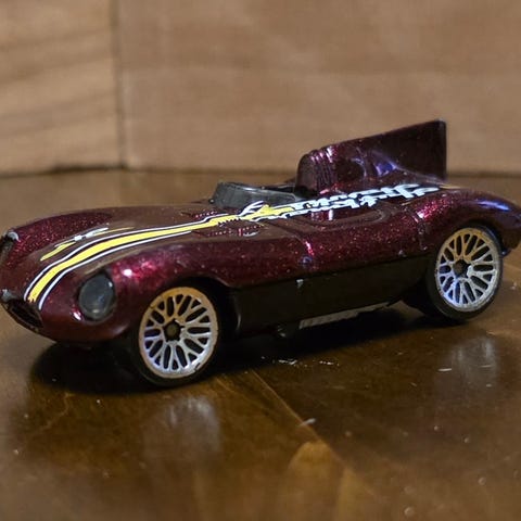 Hot Wheels pienoismalli, sininen urheiluauto. Metallinen kori, muovinen alusta ja mustat pyörät. Autossa on suuri takaspoileri ja valkoisia raitakuvioita. Soveltuu leikkeihin tai kokoelmaan lisättäväksi pienoismalliautoksi.