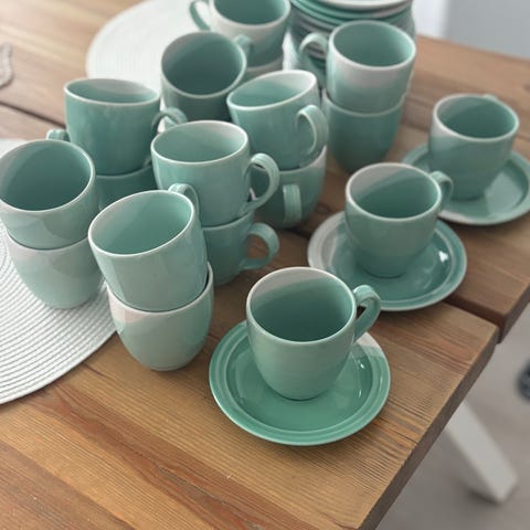 Vihreä kahviastiasto, johon kuuluu useita matalia lautasia sekä kahvikuppeja ja niiden alusia. Astiat ovat kaksivärisiä, ulkopuolelta vihreitä ja sisältä vaaleita. Sopii arki- tai kahviastiastoksi useammalle hengelle.