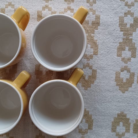 Kermansavi Oliivi Vihreä kahviastiasto lautasilla ja kupeilla.