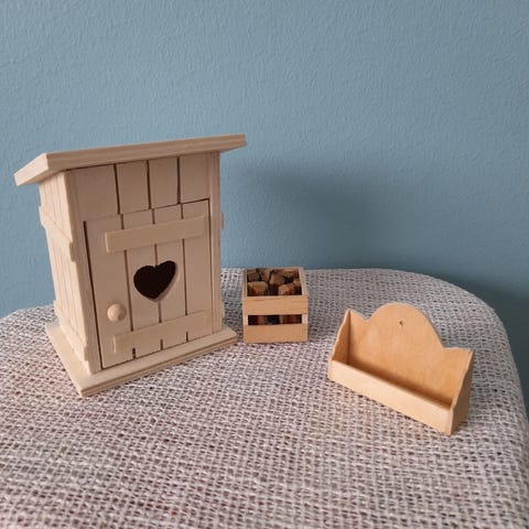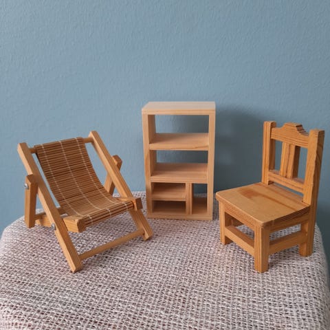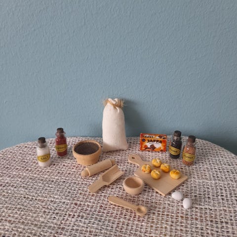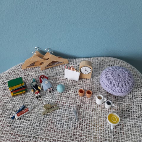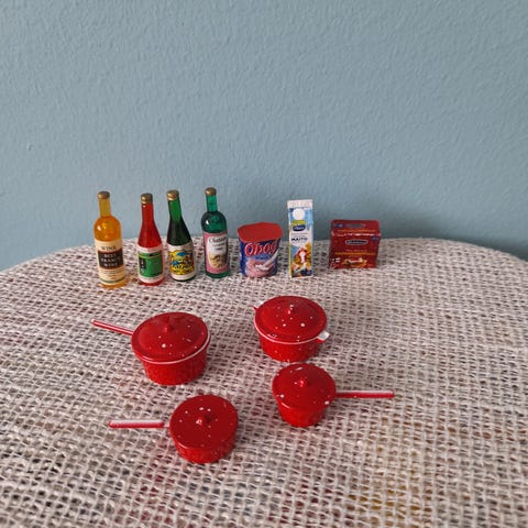 Sekalainen setti nukkekodin tavaroita ja tarvikkeita.