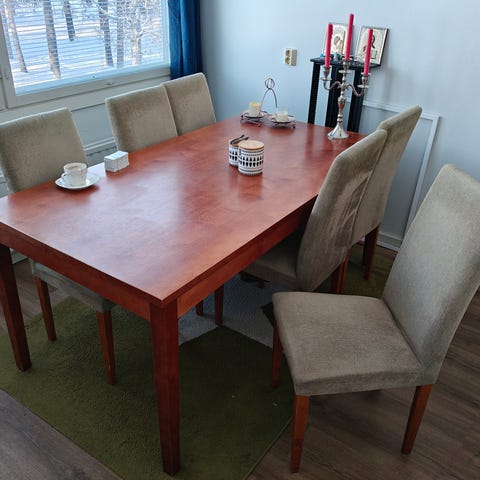 4 kpl jyskin tuoleja. Elämää nähneet, mutta käytössä ajaa asiansa. Joitakin tahroja löytyy, jotka lähtenee pesemällä.