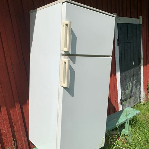 Pieni Whirlpool-jääkaappi. Korkeus 85 cm, leveys 54 cm, syvyys 60 cm.
