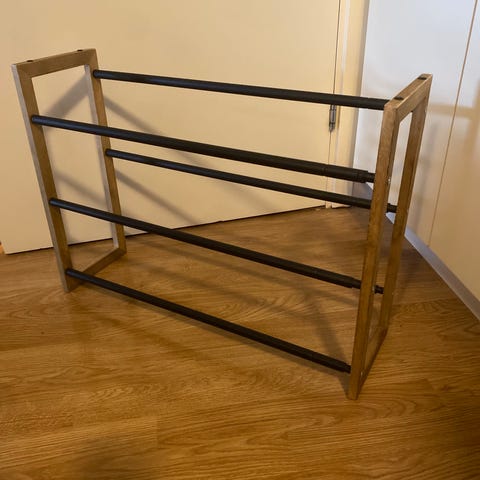 Valkoinen ehjä kenkäteline, reunoissa on hieman huomaamattomia käytön jälkiä.