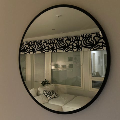 Myydään Ikean Stockholm-peili. Tammiviilua. Kiinnitysreiät takapuolella. Halkaisija 80cm.