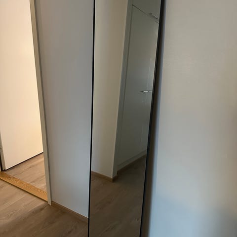Peili, jossa on musta kehys. Sopii esimerkiksi eteiseen tai makuuhuoneeseen kokovartalopeiliksi.