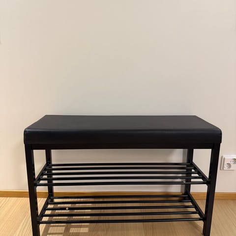 Myydään erittäin hyväkuntoinen ja tukeva kenkäteline, jossa on tyylikäs puunvärinen kansi ja musta metallirunko