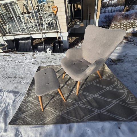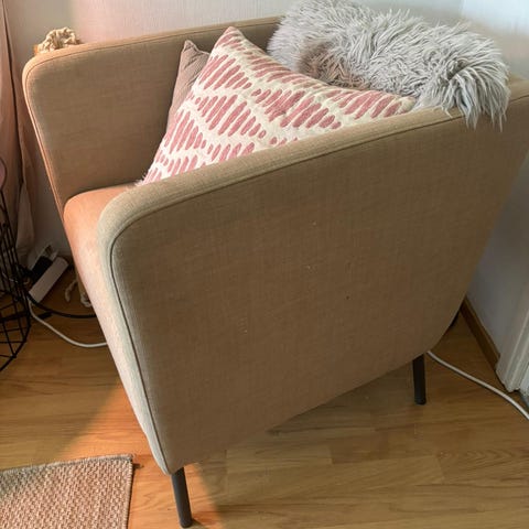 Myydään siistikuntoinen nojatuoli sekä rahi. Rahissa jokin tahra, josta kuva. Päällysteet saa helposti irrotettua ja pestyä.