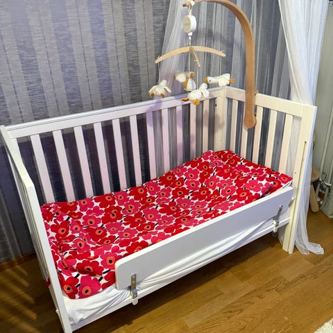 Jollyroom pinnasänky. Valkoinen pinnasänky, jossa sälepohja. Kuvissa näkyy erillinen patja, joka sopii pinnasänkyyn. Valkoinen patjanpäällinen juuri pesty. Pinnasänkyä ei ole pesty. Sänky on tavanomaisen kokoinen pinnasänky. Kysy mittoja viestillä. Vain haku. Meillä ollut 5 vuotta käytössä kahdella lapsella. Pohjan saa kolmelle eri korkeudelle.