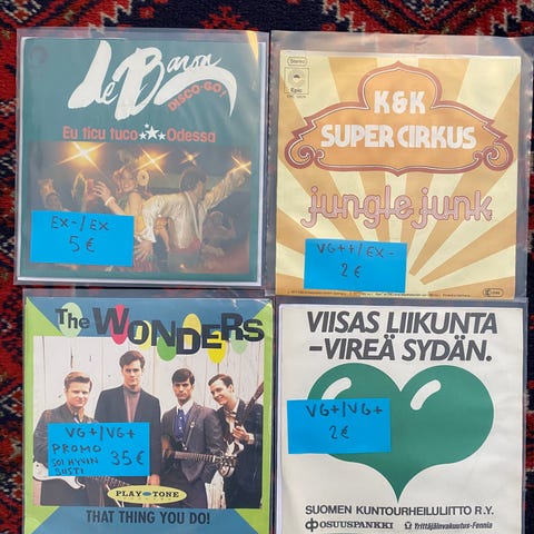 Myydään 7” singlejä. Ilmoituksia on useita, kannattaa katsoa. Levyjä voi tulla hakemaan Helsingistä tai sitten voin lähettää. Lähetyksen alaraja 10€ (katso myös lp-levyt). Kysele jos et saa selvää mitä kuvissa lukee.