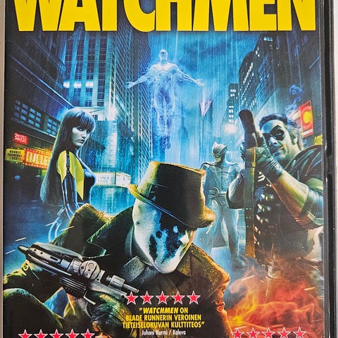 Watchmen elokuva DVD-julkaisuna. Fyysinen DVD-levy kotelossa. Takakannessa ikärajasuositus 16. Sopii DVD-soittimille ja yhteensopiville laitteille elokuvan katseluun kotona.