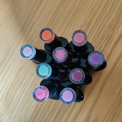 Luumu, musta, kimaltavat pinkki ja punainen, sekä harmaa, ovat lähes täysiä. Lopuissa arviolta puolet tai saattaa olla enemmänkin. Lakat on avaamisen jälkeen säilytetty jääkaapissa. Avattuna olleet reilusti alle 12kk.