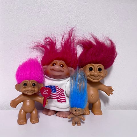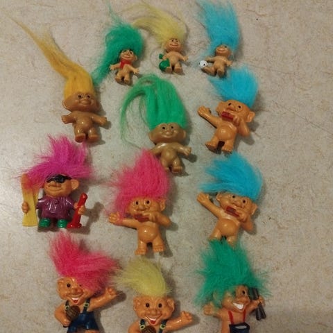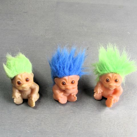 Trolli trollinuket, pieni koko. Setissä viisi nukkea, joilla on eriväriset hiukset (sininen, ruskea, musta ja valkoinen). Seisovat om merkkiä Dam. Nukkejen materiaali on muovia/pehmeää muovia, hiukset tekokuitua. Nuket ovat alastomia ja eri asennoissa (seisova, istuva, makaava). Sopivat leikkeihin tai koristeeksi esimerkiksi kokoelmaan. Yhteishinta
