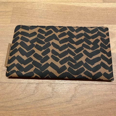 Marimekko pussukka unisex-käyttöön. Pussukassa on ruskea pohjaväri ja musta graafinen kuviointi. Materiaalina on muu tekstiilimateriaali. Vetoketjusulku yläreunassa. Sopii esimerkiksi pienten tavaroiden, kosmetiikan tai kirjoitusvälineiden säilytykseen ja kuljettamiseen.