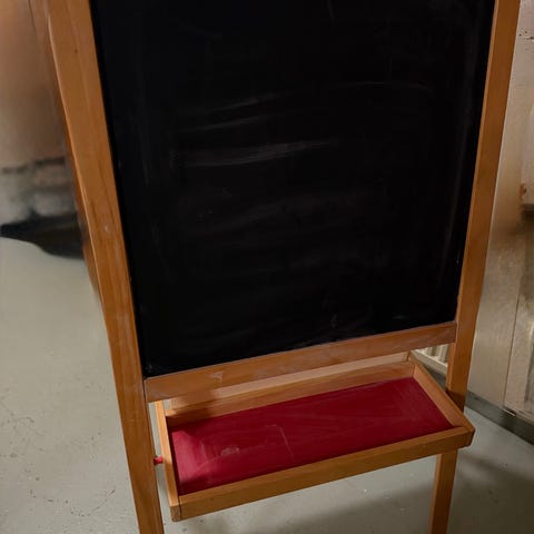 IKEA lasten piirtotaulu, kaksipuolinen malli. Toisella puolella liitutaulu ja toisella puolella valkoinen piirto-/kirjoituspinta. Runko on puuta ja taulun alla on hylly tarvikkeiden säilytykseen. Soveltuu lasten piirtämiseen, kirjoittamiseen ja leikkeihin sisäkäytössä.