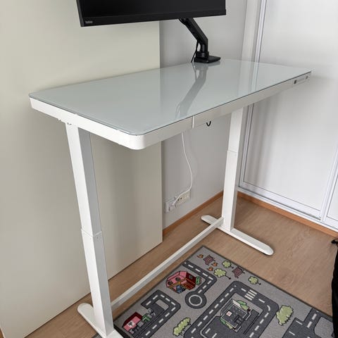 Kannen mitat 80cm leveys ja 60cm syvyys. Korkeus säädettävissä 71cm-118välilä. Käyttöpaneelin puolta voi vaihtaa ja siinä on myös kaksi muistipaikkaa. Ihan ok pöytä pieneen tilaan. Vähän ”huojuva” korkeimmissa asennoissa joten jos tarkoitus enimmäkseen seisten työskennellä, niin voi olla että joku tukevampi voisi olla parempi. Itse olen käyttänyt tuota läppärin kanssa ja istuen, niin siihen käyttöön oikein passeli hintaisekseen.