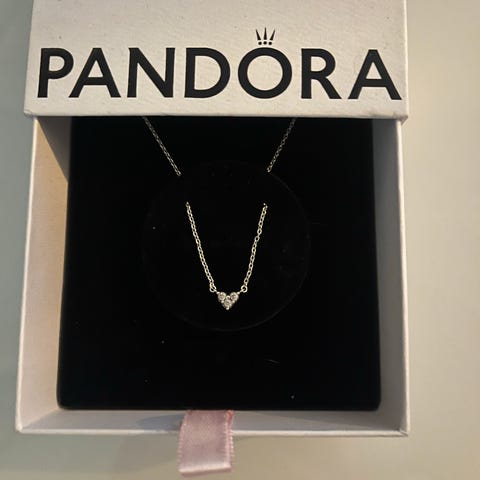 Pandora kaulakoru, jossa kullattu ketju ja sydämenmuotoinen kristalliriipus. Materiaalina kullattu metalli ja kirkas kristalli. Koru on täysin käyttämätön.