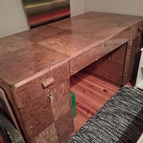 Hyväkuntoinen (hieman käytön jälkiä) puinen vankka kirjoituspöytä. Näyttävää antiikkia/vintagea. Pöytä on täyttä puuta, eli painava. Meillä ei enää käyttöä pöydälle.