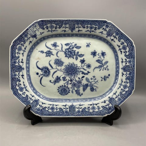 Kiina Qianlong Sinivalkoinen posliinivati, jossa on yksityiskohtainen kukka- ja lintukuviointi. Vadin reunaa koristaa geometrinen kuviointi.Tyyli on klassinen kiinalainen posliini, joka tunnetaan hienostuneista sinisistä kuvioistaan valkoisella pohjalla.Vati on hyvässä kunnossa ilman näkyviä vaurioita.