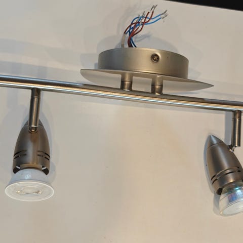 Kattokohdevalaisin, 3 lamppua. Ei pistotulpallinen malli, mutta helppo tehdä sellaiseksi.