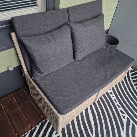 Myydään joko yhdessä tai erikseen pihan kalusteet: sohva (tämä kaksi yhdistettyä nojatuolia eli saa halutessaan erotettua kahdeksi tuoliksi taas), pieni musta sohvapöytä ja musta-beige muovinen piha matto. Jos haluaa mukaan voi saada myös kuvassa näkyvät valot.