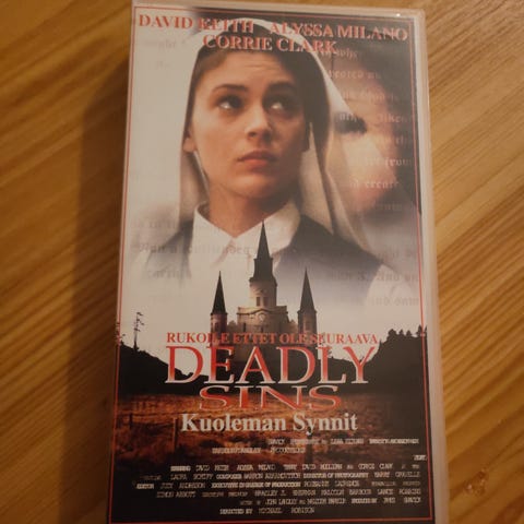 Valkopukuinen nainen vhs. Kasetti muoveissa.