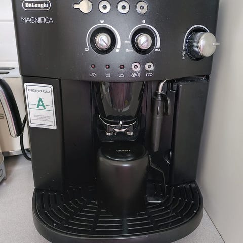 De'Longhi Magnifica kahviautomaatti. Täysautomaattinen espressokeitin, jossa on integroidut painikkeet espressolle ja muille kahvijuomille. Laitteessa on erillinen höyrysuutin maidon vaahdottamiseen sekä tippakaukalo irrotettavalla ritilällä puhdistusta varten. Sopii kahvipapujen automaattiseen valmistukseen kotikäyttöön. Värinä musta hopeisilla yksityiskohdilla.