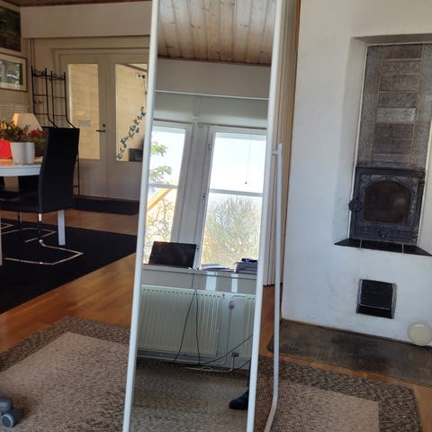 Ikeasta ostettu lattiapeili. Peilin takana koruteline. 48x160cm