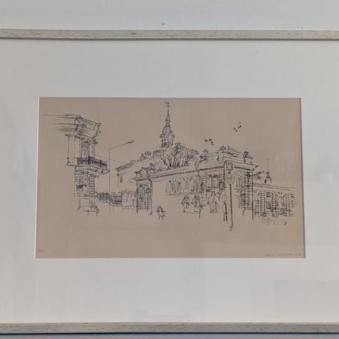 Raimo Huittisen signeeraama grafiikka vuodelta 1976. Teoksessa kuvaa Porin teatteria.