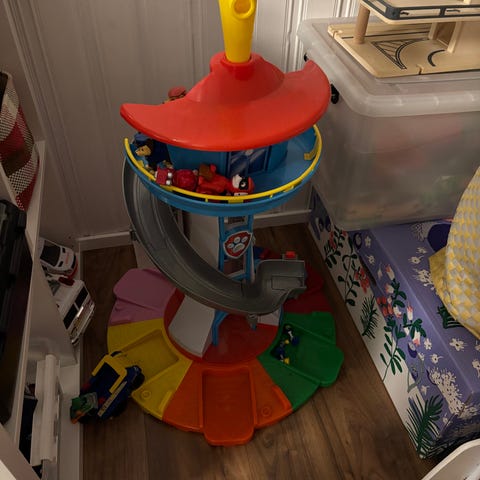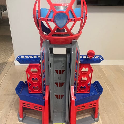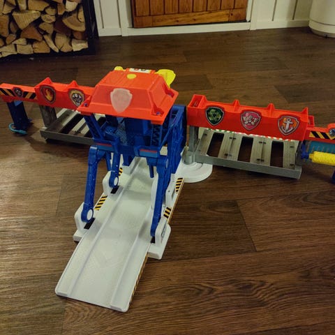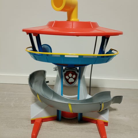 Ryhmä Hau leikkitorni, Hauvaunu ja ajoneuvot. Settiin kuuluu torni josta autot lähtevät alas kun painaa periskooppia alas. Hauvaunu ja Robokoira. Samppa, Vainu, Rekku, Rolle, Kaja, Toma ja Halti. Leikkisetti on ollut suosittu lelu ja kovassa käytössä. Kuvissa näkyy rikkoutunut liukuradan alaosan kiinnityskohta tornin alaosassa. Sen voi vaikka teipata kiinni. Muita vakavia vaurioita ei ole mutta autoissa on kolhuja ja leluissa käytön tuomaa kulumaa.