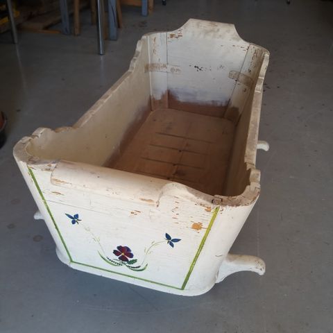 Vanha umpipuinen valkoiseksi maalattu pienokaisen ensimmäinen sänky vailla uutta kotia. Tukeva ja jämäkkä kaluste, jonka ikää en osaa arvioida. Kaunista puusepäntyötä, molemmissa päädyissä sydämenmuotoiset koristeaukot. Valkoisessa maalipinnassa on hieman vuosikymmenten saatossa tullutta kulumaa. Ainakin rustiikkisempaan sisustukseen sopii hyvin tällaisenaan, mutta toki halutessaan voi myös tuunata ja maalata mieleisekseen. Kehto on ollut vuosikymmeniä lämpimässä varastossa, ja jo kunnollisella puhdistamisellakin saa huomattavasti siistimmän. Kehdon koko on: