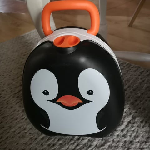 My Carry Potty lasten matkapotta leppäkerttu-kuosilla. Pottamalli on kannettava ja suljettava, ja siinä on kantokahva kuljettamista varten. Tiivis, joten ei haittaa vaikkei voi heti tyhjentää. Ollut mukana lentokoneessa ja monessa reissussa, ihan ehdoton kapistus.