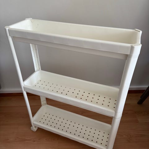 Valkoinen seinäkaappi, jossa yksi ovi ja metallinen ulosvedettävä kori. Kaappi soveltuu esimerkiksi kodinhoitohuoneeseen tai kylpyhuoneeseen säilytystilaksi. Kaappi on irrotettu paikaltaan