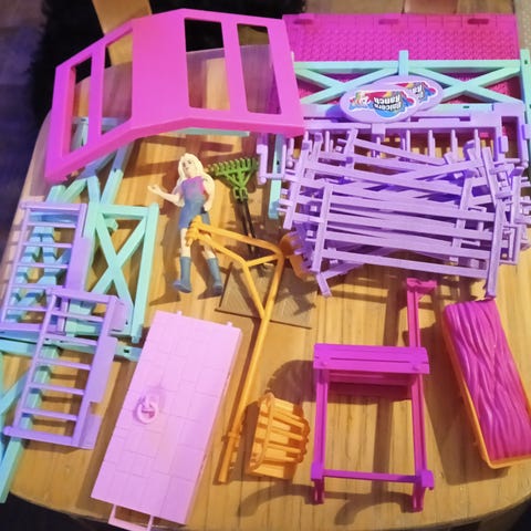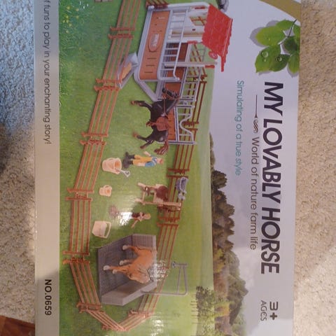 Hevostalli ja hevoset varusteineen. Haku rantakylästä.