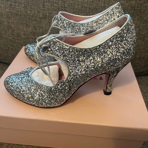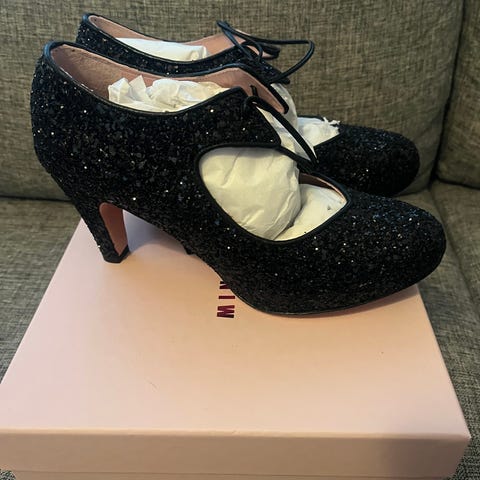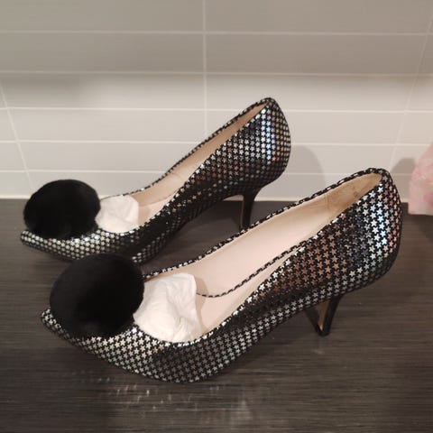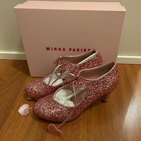 Myydään mustat Minna Parikka Let’s Dance korkokengät koossa 38. Teksti valkoisella. Hyvä kunto, ollut jalassa muutaman kerran, pohjissa ainoat käytönjäljet. Ei painaumia, korkolaput hyvässä kunnossa. Koron korkeus 5,5 senttiä. Kauppaan kaikki alkuperäinen, silkkipaperit, pehmusteet, kenkäpussi ja laatikko. Kenkäpussissa jotain tummaa, ei ole yritetty poistaa. Laatukengät, hyvät jalassa. Ei enää tuotannossa.