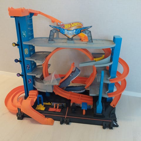 Muutaman vuoden innokkaalla pikkuautoilijalla käytössä ollut Hot Wheels -parkkitalo. Paljon parkkipaikkoja pikkuautoille, rata laskemista varten ja hissi. Valmiina lähtemään uuteen kotiin ilahduttamaan seuraavaa auto fania. Mukana myös dino, jonka voi laittaa terrorisoimaan pikkuautojen vauhtikisoja.