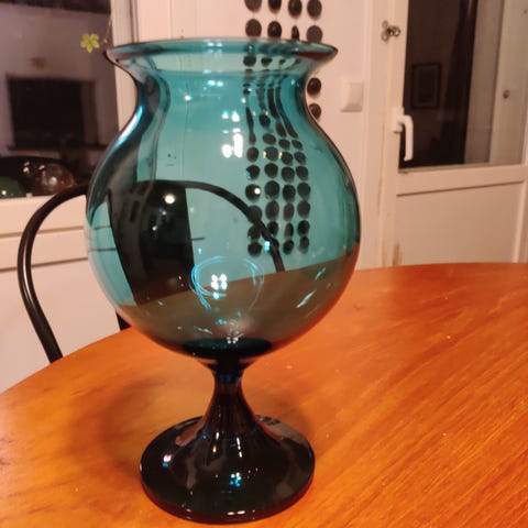 Riihimäen lasin vihreä candido maljakko jonka suunnitteli Nanny still. Hieman harvinaisempi vihreä väri. Maljakon korkeus 20.5 cm. Suuakosta lohjennut ohut lastu näkyy kuvissa muuten siisti kunto.