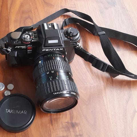 Exakta TL-500 filmijärjestelmäkamera, jossa vaihdettava objektiivi. Kamerassa mekaaniset säätimet ja optinen etsin. Mukana useita erikokoisia objektiiveja etu- ja takasuojilla sekä filmirulla. Rungossa hihnakiinnikkeet ja mekaaninen suljin. Sopii 35 mm filmille. Kokonaisuus sisältää myös kameralaukun säilytystä ja kuljetusta varten.