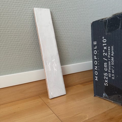 Laattapisteestä ostetut Italialaiset keraamiset laatat. Kuvissa laatat on ladottu vinoraitakuvioon, mutta ne voidaan asentaa myös muihin ladontamalleihin.