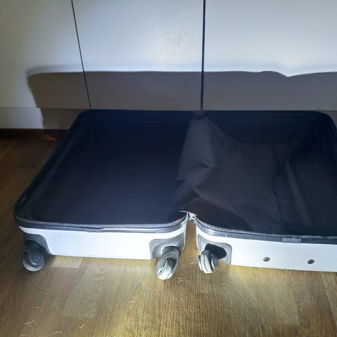 Matkalaukku, josta puuttuu rengas. Vielä tuolla pystyi reissamaan. Laukku odottaa terassilla ja menee ensimmäisenä hakevalle.