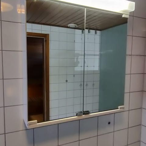 Polaria peilikaappi valolla kylpyhuoneeseen. Kaapissa on useita hyllyjä pientavaroiden ja hygieniatuotteiden säilytykseen. Yläosassa on kiinteä valaisin.